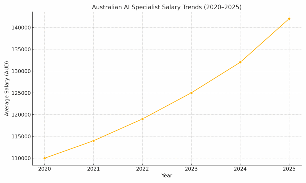 Salaries for AI specialists in Australia have increased by around 8% in 2025, according to data from the 2025 Hays Salary Guide, directly influencing overall project costs. The Economic Research Institute (ERI) also reports that the average salary for an AI Specialist in Australia in 2025 is approximately AUD 156,917 per year. This reflects a steady increase over the past five years, aligning with the growing demand for AI expertise across various industries.