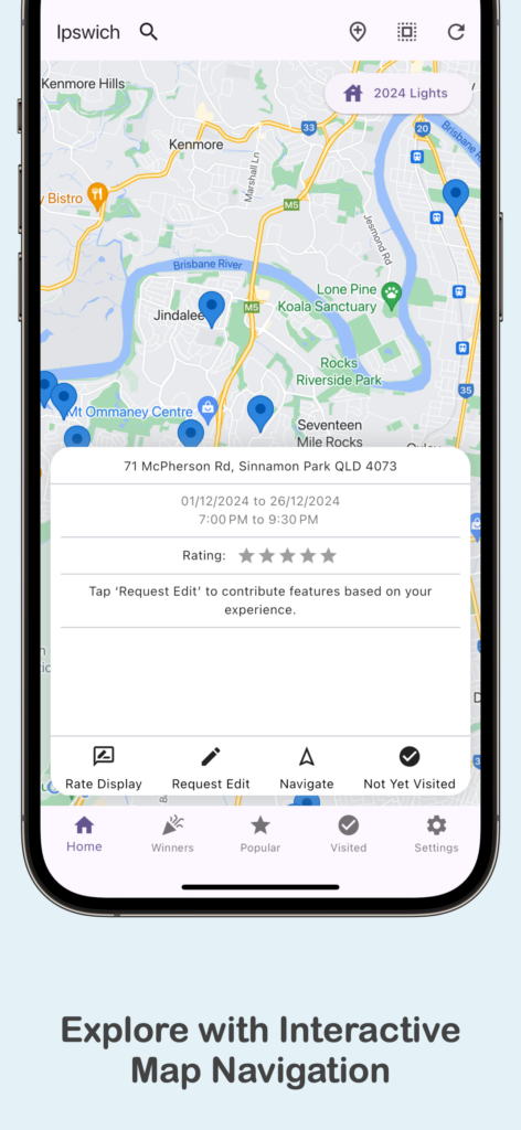 - Interactive Map Navigation: Explore Christmas lights displays near you using an interactive map. Search by city or LGA (Local Government Area) to plan your perfect festive outing.