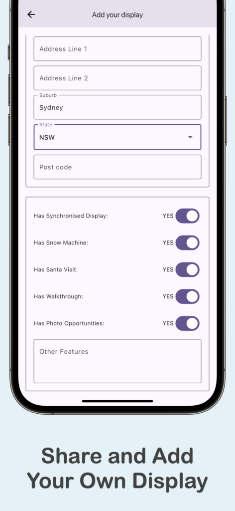 - Share and Add Displays: Have your own display or know of a hidden gem? Add it to the app to share the festive spirit with others.