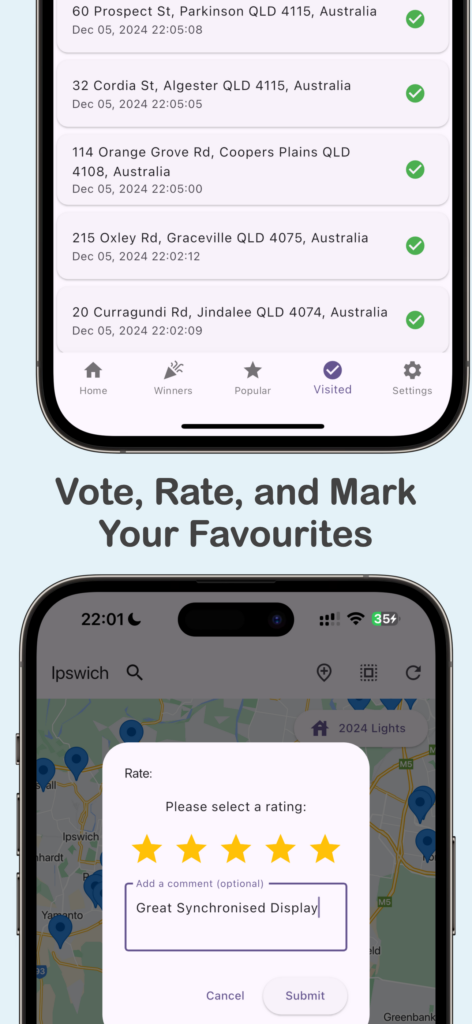 - Search by Location: Use the handy search bar to find lights in specific cities or suburbs. From Brisbane’s stunning riverfront displays to Sydney’s iconic neighbourhoods, you’ll never miss a twinkle.